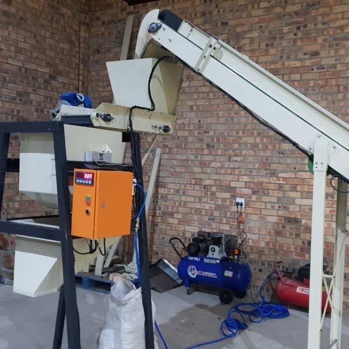 The Dumper Scale is a precision bagging solution designed to enhance speed and accuracy in bulk material packaging. Featuring an integrated conveyor belt above the scale, it allows for controlled product feeding with fast and slow speed options to improve filling accuracy. Operators can store multiple bag weight settings, enabling quick changeovers between product types or package sizes. The system supports the addition of a foot switch for hands-free operation, enhancing workflow efficiency. Powered by single-phase electricity, this scale is perfect for use in agricultural, industrial, or warehouse environments where reliability and throughput are essential.